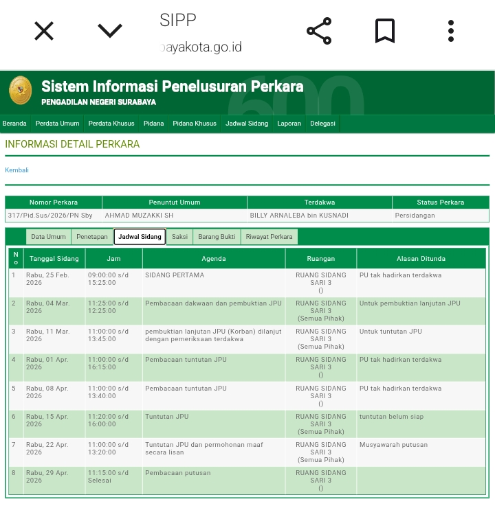 Dari pantauan Sistem Informasi Penelusuran Perkara (SIPP) Pengadilan Negeri Surabaya, dokumen tuntutan tersebut belum diunggah, sehingga memunculkan pertanyaan dari awak media yang biasa meliput di PN Surabaya.