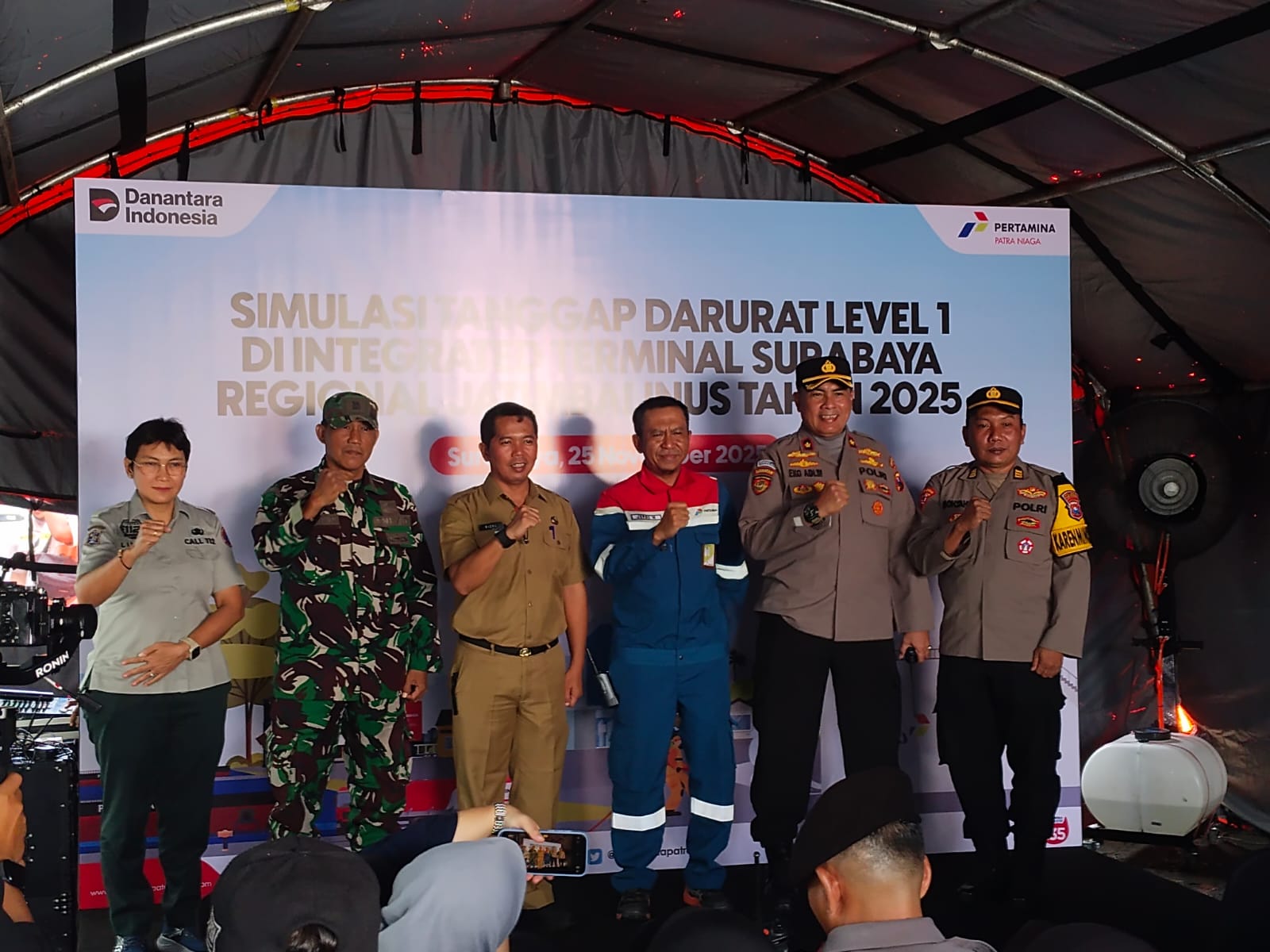 Surabaya, Timurpos.co.id – Integrated Terminal Surabaya Regional Jatimbalinus menggelar Simulasi Tanggap Darurat Level 1 pada Selasa pagi (25/11/2025) di Jalan Perak Barat No. 277 Surabaya. Kegiatan ini turut dihadiri Kapolsek Pabean Cantikan Kompol Eko Adi Wibowo, S.H., M.H., bersama jajaran Forkopimka serta berbagai stakeholder terkait dalam upaya meningkatkan kesiapsiagaan terhadap potensi keadaan darurat di area objek vital nasional Pertamina.