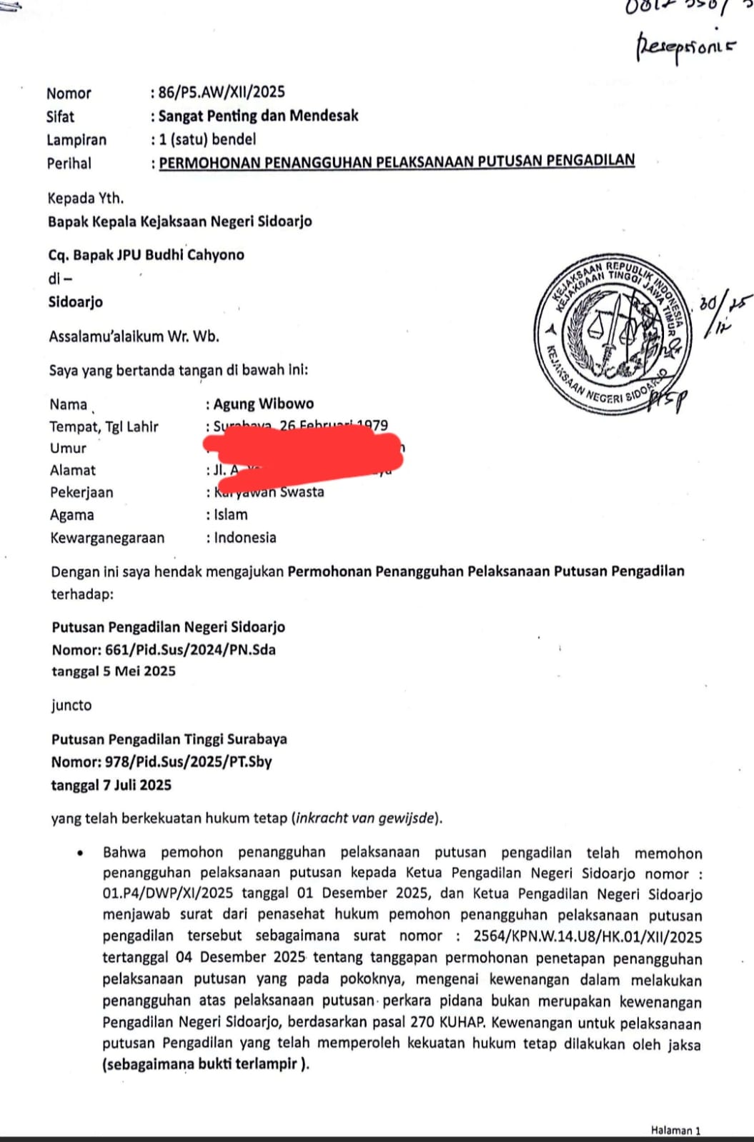 Sidoarjo – Timurpos.co.id – Keluarga terpidana Agung Wibowo (47), warga Surabaya yang kini menjalani hukuman di Lapas Kelas IIA Sidoarjo, mengeluhkan lambannya respons Kejaksaan Negeri (Kejari) Sidoarjo terhadap permohonan penangguhan pelaksanaan putusan pengadilan. Permohonan tersebut diajukan dengan alasan kondisi kesehatan terpidana yang memiliki riwayat penyakit jantung.