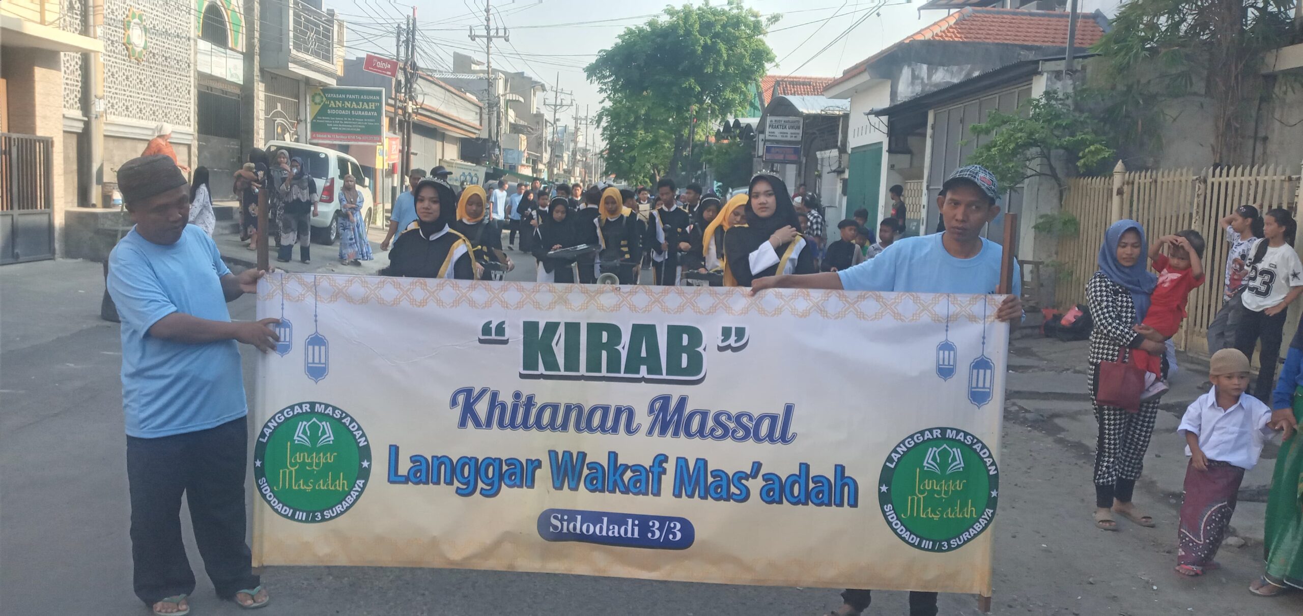 Sebanyak 100 anak dari berbagai wilayah di sekitar Sidodadi dan Simokerto mengikuti khitanan massal tersebut. Kegiatan diawali dengan kirab keliling kampung, diiringi drumband pelajar dan barisan peserta yang membawa spanduk bertuliskan “Kirab Khitanan Massal Langgar Wakaf Mas’adah”, menciptakan suasana semarak dan penuh syiar Islam.