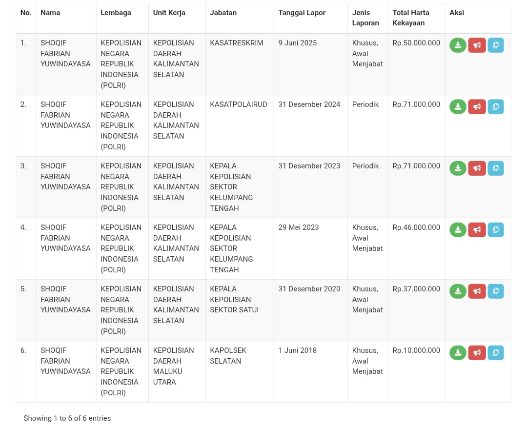Angka Rp71 juta tersebut juga tercantum dalam laporan periodik per 31 Desember 2024, saat yang bersangkutan tercatat menjabat sebagai Kasat Polairud Polda Kalimantan Selatan.